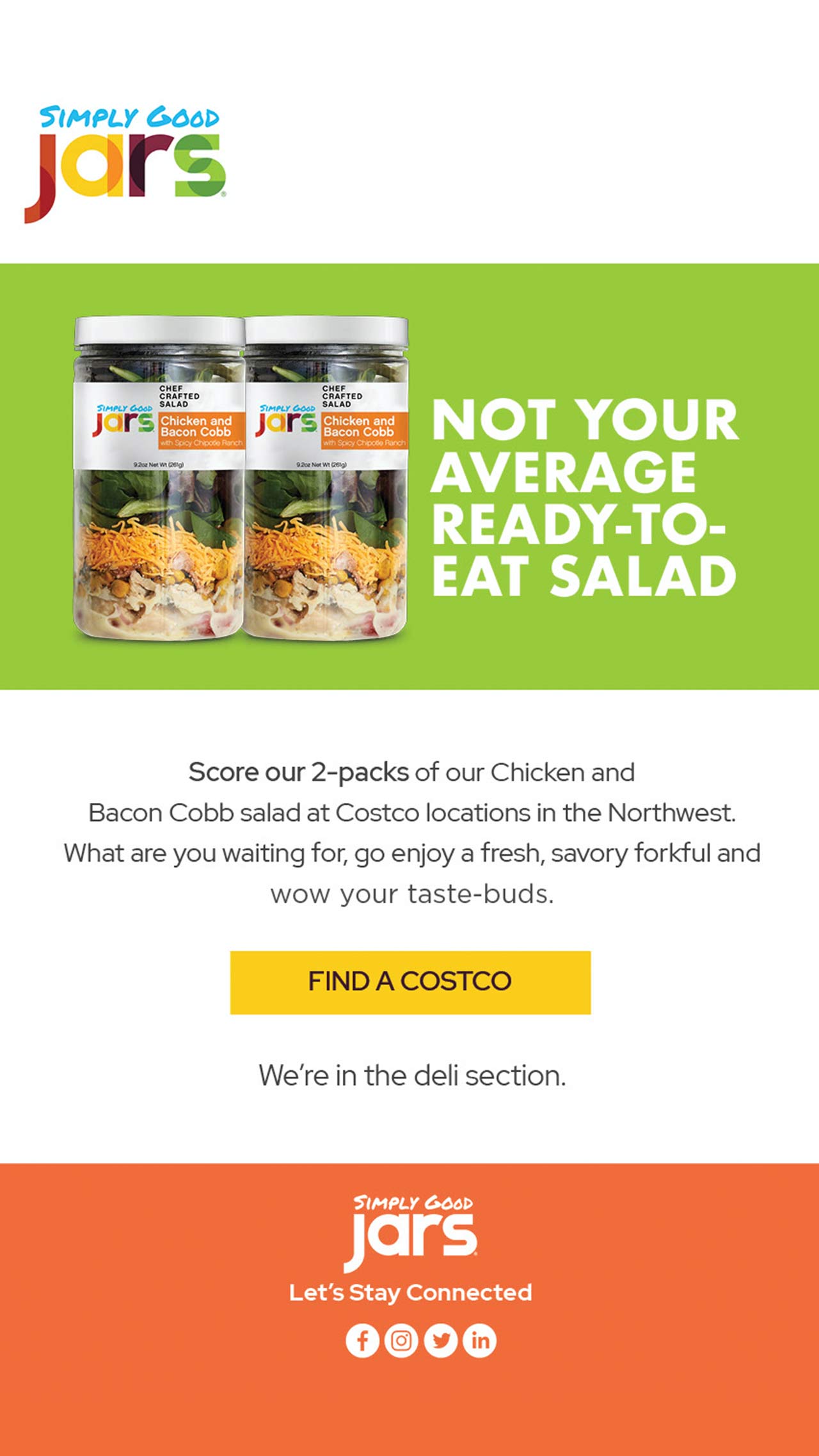 Simply Good Jars is a premier pre-made salad line that got its first opportunity into Costco in the Northeast and was looking to drive awareness and sales. We were tasked with creating a fun campaign to introduce the two salads and to support the Costcos that carry it.